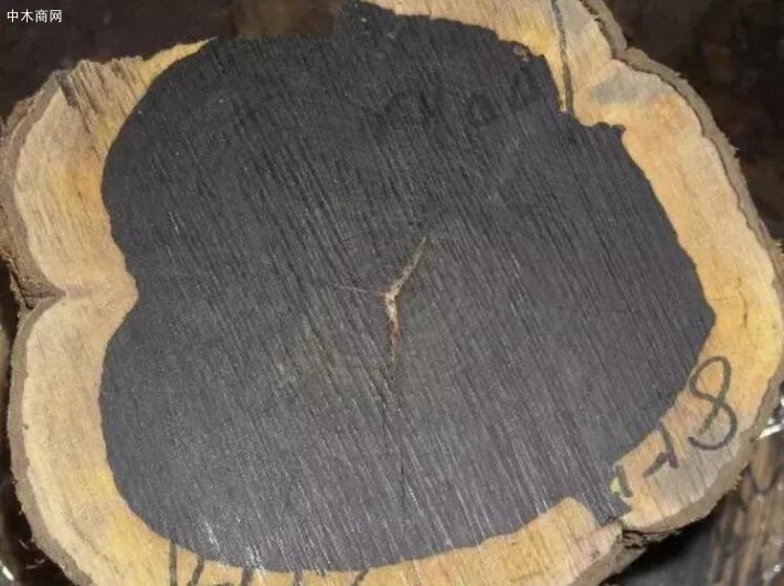 市场上东非黑黄檀多为未经处理的圆材,半径多为20-30厘米,也有40-50厘米的,长度2-3米,边材很薄,灰白至黄色,心材紫黑色。木材多扭曲呈“S”形,灰色的树皮多不规则隆起并翘曲开裂。