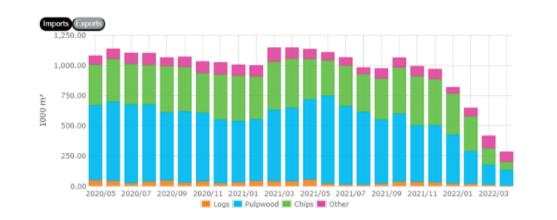 4月份当月芬兰木材进口总量已降至28万立方米,同比下降75.4%。与去年同期相比,纸浆木材的进口量下降了 56%。木片进口下降46%,原木进口下降65%。