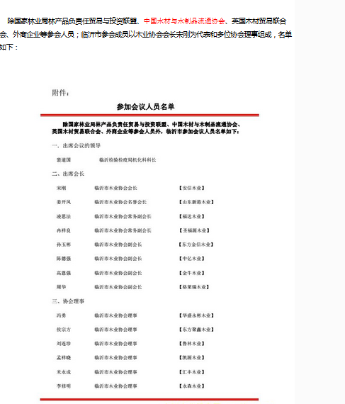 除国家林业局林产品负责任贸易与投资联盟、中国木材与木制品流通协会、英国木材贸易联合会、外商企业等参会人员;临沂市参会成员以木业协会会长宋刚为代表和多位协会理事组成,名单如下: