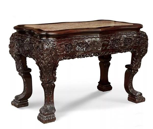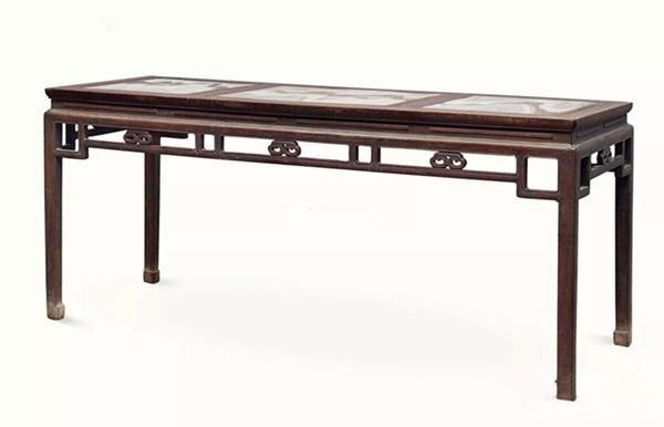 图6:清中期 红木三镶云石面画案, 拍卖成交价格估计:RMB 360,000-480,000,比较终成交价格:RMB 1,000,500, 拍卖专场:北京匡时国际拍卖有限公司 2017迎春拍卖会, 拍卖成交时间:2017-03-30, 尺寸:84×192×1700px。