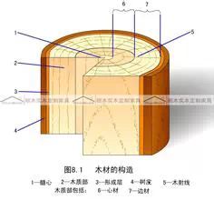 树木采伐后的横截面呈不规则的圆形,能清楚地看到树皮、形成层、年轮、髓心、髓线的排列状况。加工利用中把靠髓心部分的木材称心材,靠树皮部分的木材称边材,心材和边材中间部分称中材。而材质比较好的地方就是中材部分。