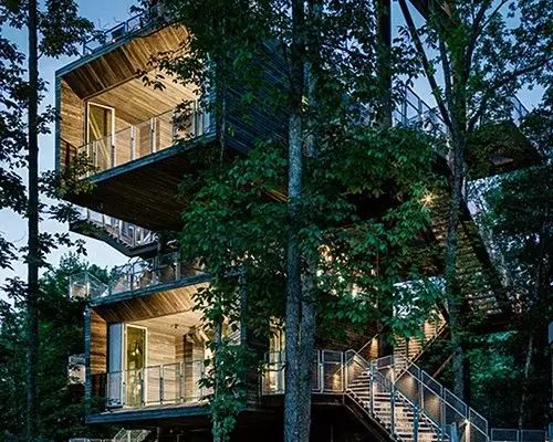这间建造在美国田纳西州中心深处的树林里,这间古老而雄伟的树屋均由再回收木材组成。