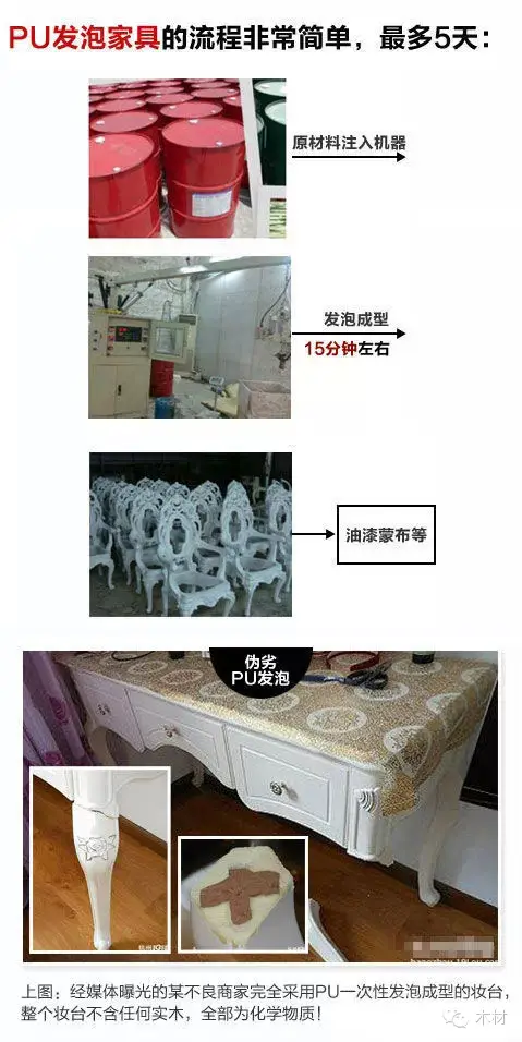 由于制造工艺简单,价格低廉,正因为这些特点目前有很多厂家生产的PU发泡家具在市场上泛滥。实在的商家在销售的时候会说是内置实木,有更多的商家,会美其名曰,“高科技的制造工艺,或者是让你听了高深莫测的的什么材质”。