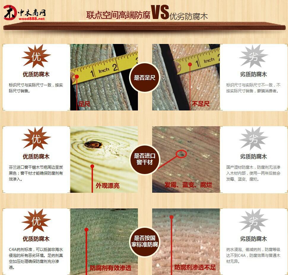 普通的木材易遭到白蚁的侵蚀,用不了多久会腐蚀,对人体造成的危害较大,丰胜花园木引用国外木材防腐先进技术,采用“真空—压力—真空”的工艺,防腐剂注入到木材内部,芬兰防腐木是经真空脱脂后,在密闭的高压仓中灌注水溶性防腐剂ACQ,使防腐剂浸入木材的深层细胞从而使木材具有抗真菌、防腐烂、防白蚁的功效。