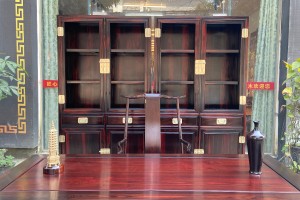 而对于老挝大红酸枝明式书房的功能性,客户则从与匠心居红木多年的合作谈起。“多年前,我和李贵先生合作,开展‘产学研’结合攻关项目研究,旨在高附加值利用红木木材功能,特别是红木木材保健功能开发利用取得突破,获得了中山市科技进步二等奖。匠心居红木明式经典书房家具以老挝大红酸枝木材为原料,在设计、制作、功能、布局等方面创新,开创了中国书房红木家具的新方向。”凭祥匠心居老挝大红酸枝明式书房四件套家具图片欣赏