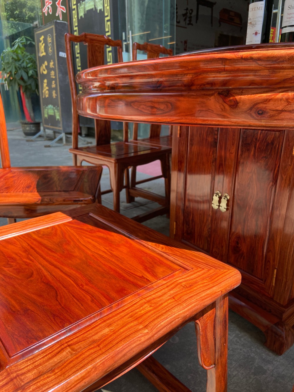 5、环保健康:海南黄花梨是一种环保健康的木材,其生长周期长,材质坚硬耐久,不含有害物质,符合现代人绿色低碳的生活理念。凭祥红木家具匠心居海南黄花梨明式圆餐桌九件套图片及厂家